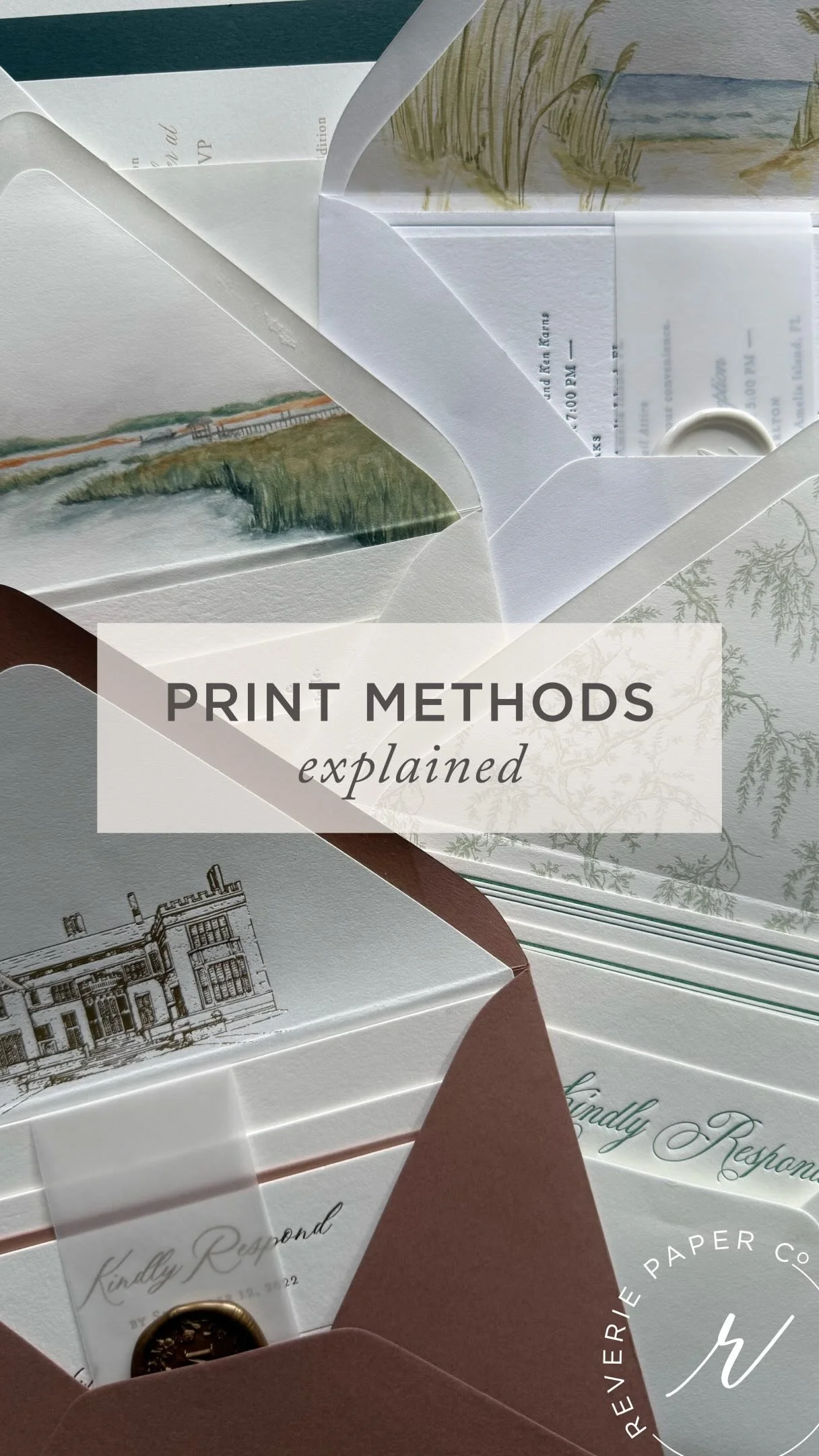 Check out our curated collection of semi-customizable suites to find the one for you. Each suite can be customized by printing method, ink color, paper thickness and color. You can further personalize your suite by adding embellishments and booking custom artwork. For more on the process, FAQs and our terms and conditions, view the links below.
